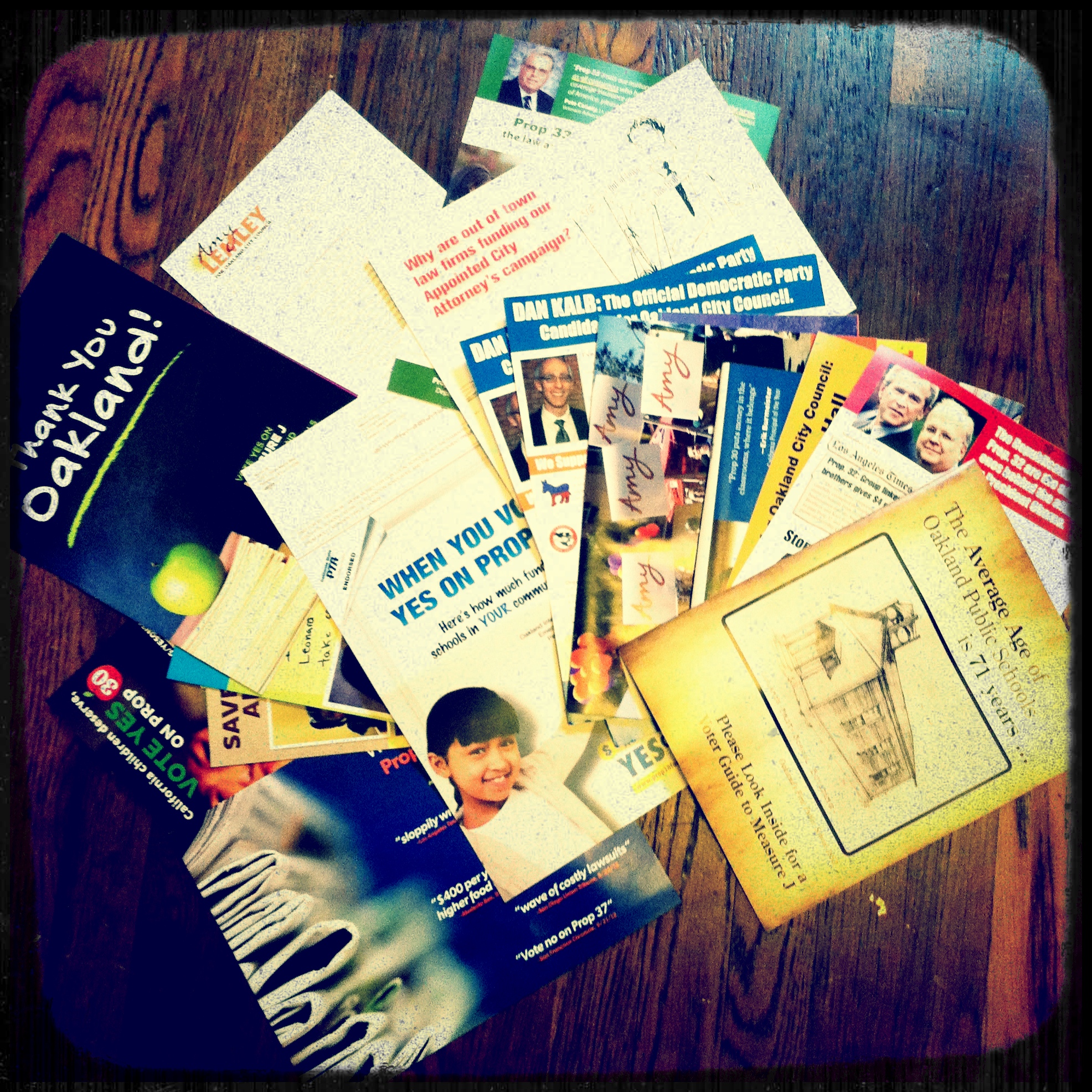 Yesterday, my mailbox was full of campaign pamphlets. Granted, I had been away from home for a few days. I was down in Palo Alto caring for my nieces while my brother and sister-in-law were out of town. But still. I just left Friday. I returned Monday. We all know that mail doesn’t come on Sunday. And there were 18 separate pieces of campaign mail in my box last night. Election Day is a week from today and, honestly, I can’t wait for it to be over.