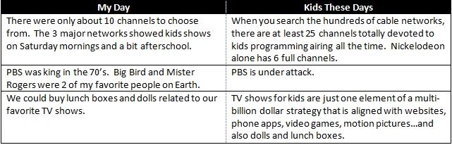 1. That’s a tough one! Can we reclaim the magic of “what was”? Our children have their own version of Saturday mornings. Is it detrimental to let them have their own? Then again, it may be wise to reclaim the simpler things or at least…..go out do something! Happy medium is probably the best.