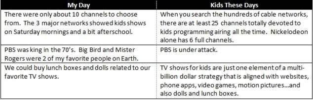 What it comes down to is this:  In “My Day,” we had fewer choices.  “Kids These Days” have so many choices that it is mind boggling.  Social science research now shows us that too many choices make us all less happy.  Being able to watch whatever we want, whenever we want, on any device we want, definitely has something to do with our kids being “entitled; unfocused; fat.”  Dontcha think?